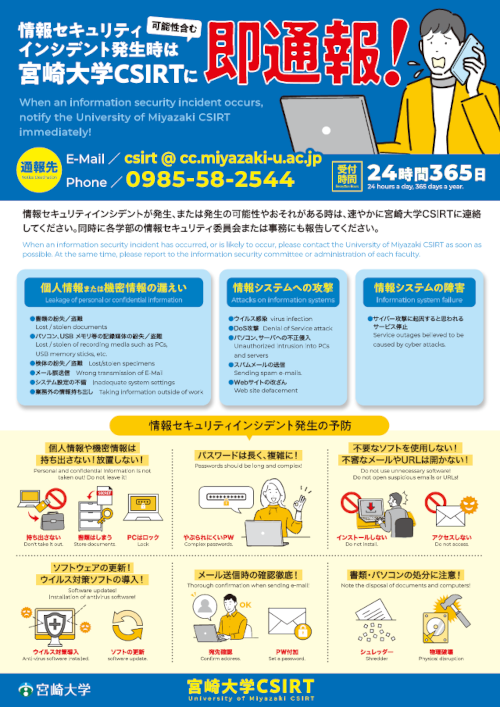 宮崎大学では、情報セキュリティインシデント対策チーム(CSIRT)を設置しています。
