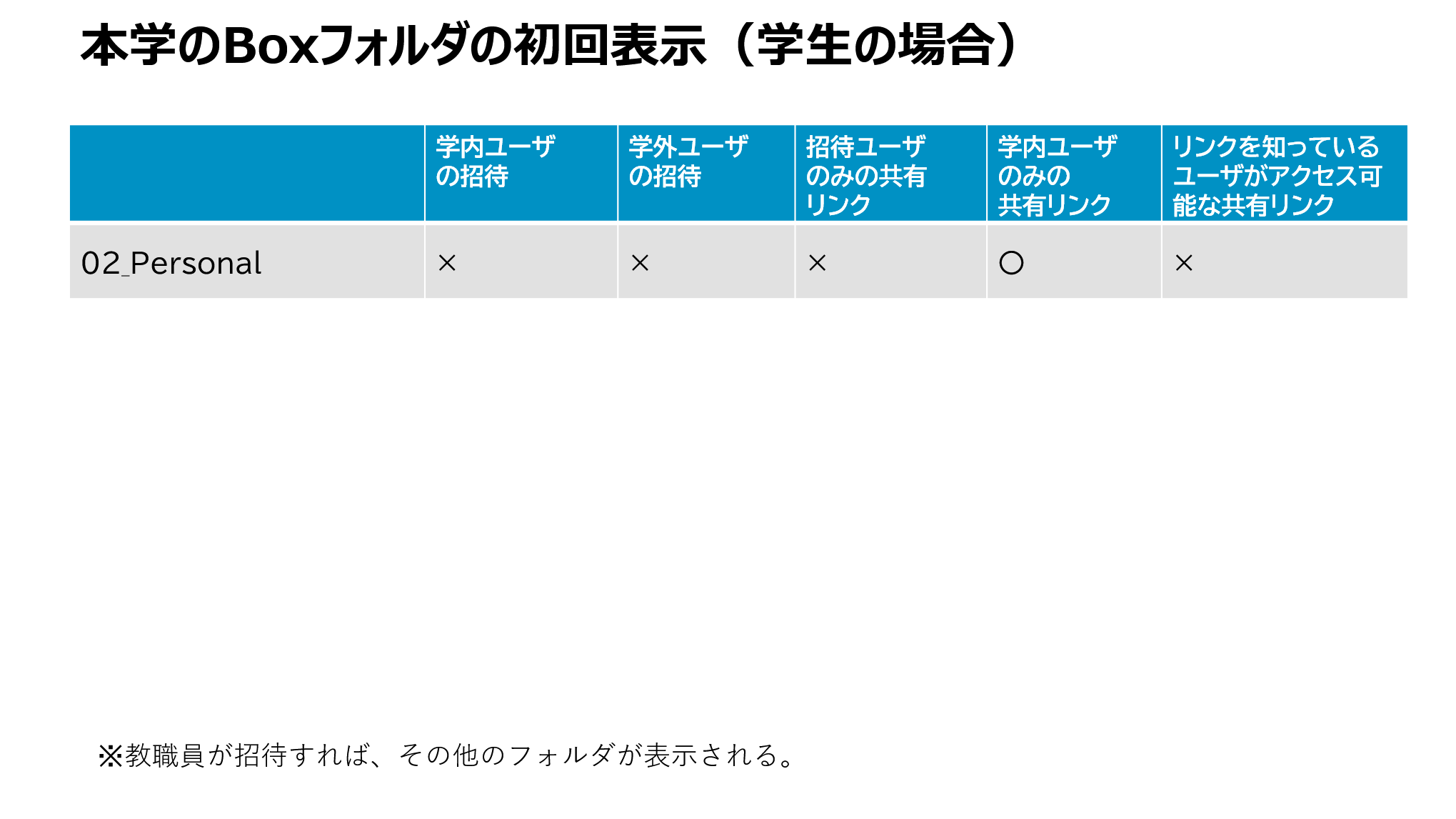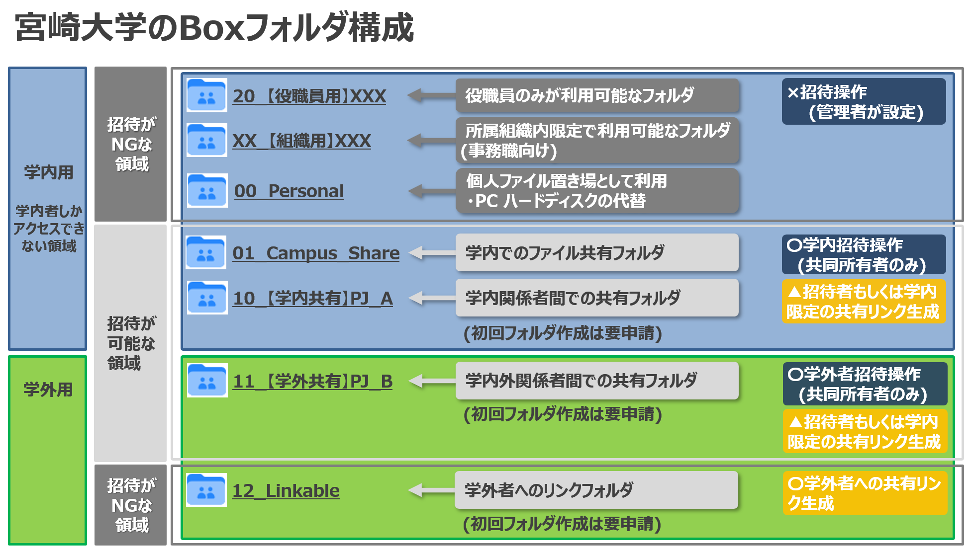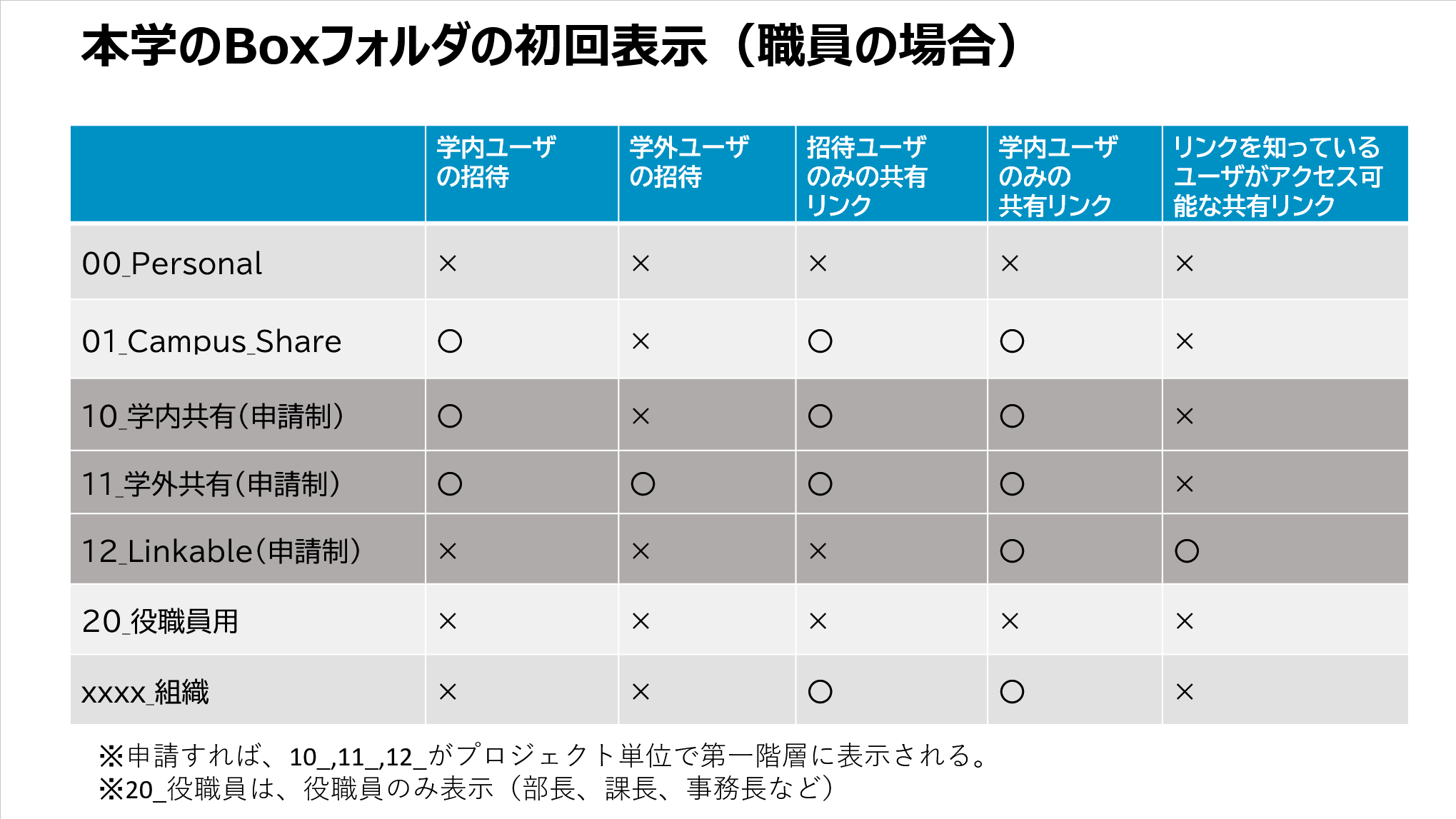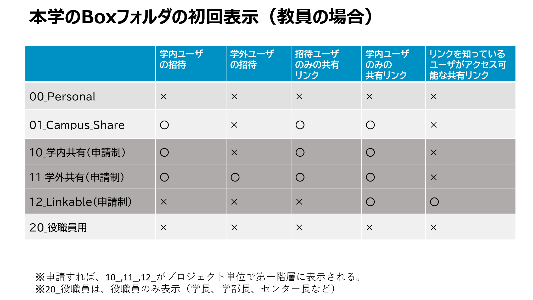 学内・学外プロジェクト用共有フォルダ、公開共有リンク用フォルダは申請制になり、毎年度末に継続利用の確認を行います。(令和8年度より)